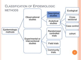 Descriptive epidemiology involves observing disease distribution in populations and identifying characteristics associated with disease. It defines the population and disease, then describes disease distribution by time, place and person. Disease is measured through cross-sectional or longitudinal studies and compared to indices to formulate etiological hypotheses. Descriptive epidemiology provides data on disease burden, clues to causation, and background for prevention planning and evaluation.