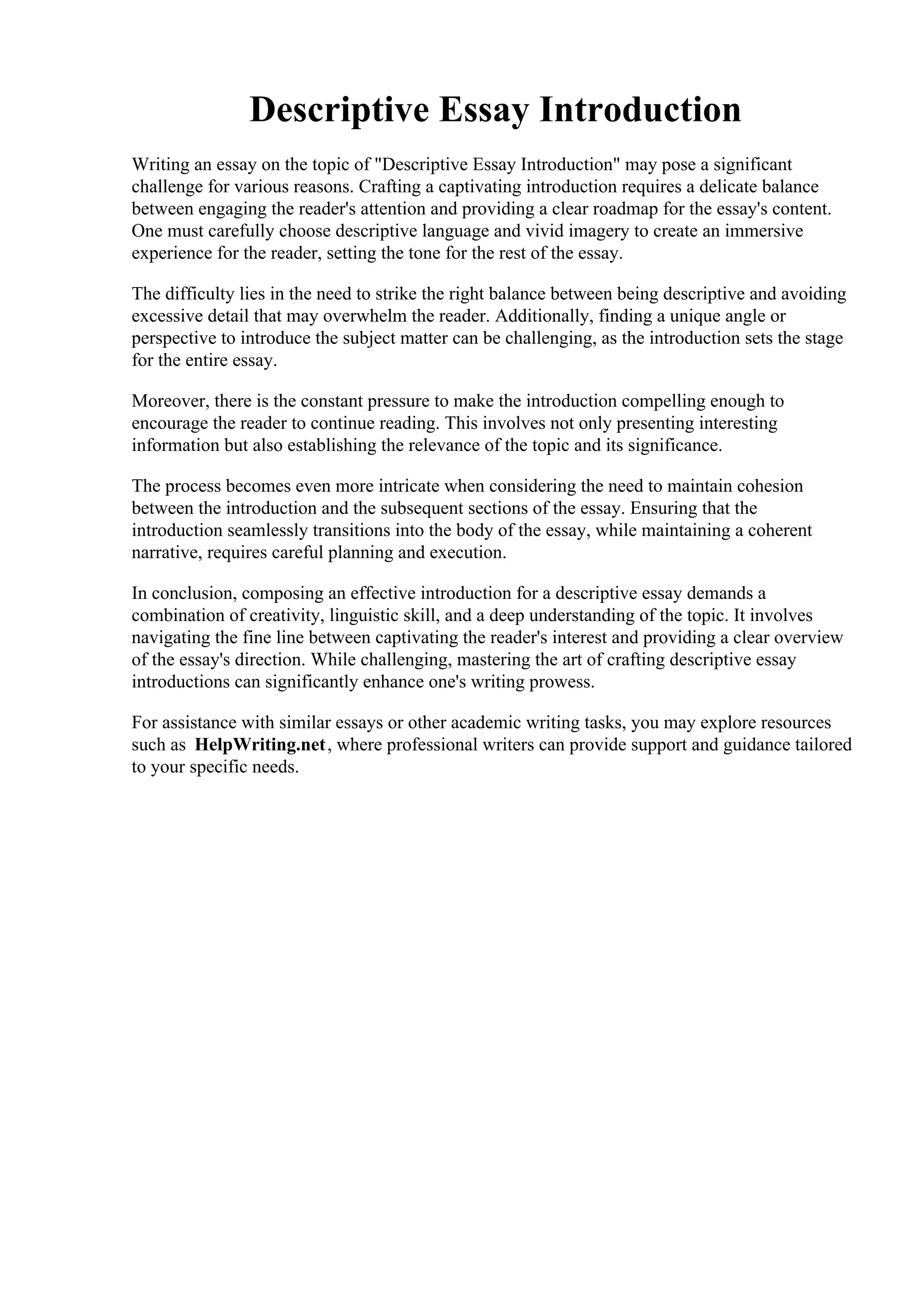 The document discusses the complexities of writing a compelling introduction for a descriptive essay, emphasizing the need for a balance between engaging language and clear structure. It highlights challenges such as maintaining reader interest and ensuring cohesion with the essay's body. Additionally, it addresses the importance of originality and effective planning in crafting a strong introduction.
