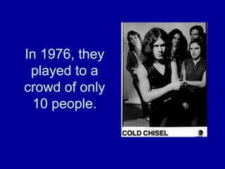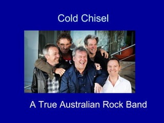 Cold Chisel is an iconic Australian rock band known for their original sound and exceptional songwriting. Formed in 1973, they struggled early on playing to small crowds but gained popularity after releasing hit songs like "Choirgirl" and signing a recording contract. Led by talented singer Jimmy Barnes and songwriter Don Walker, Cold Chisel crafted their own distinctive style and created songs that showcased Barnes' powerful vocals ranging from tender ballads to wild rock anthems. The band members came across as real people who connected with audiences and have continued performing, including benefit concerts, making Cold Chisel a truly special part of Australia's music history.