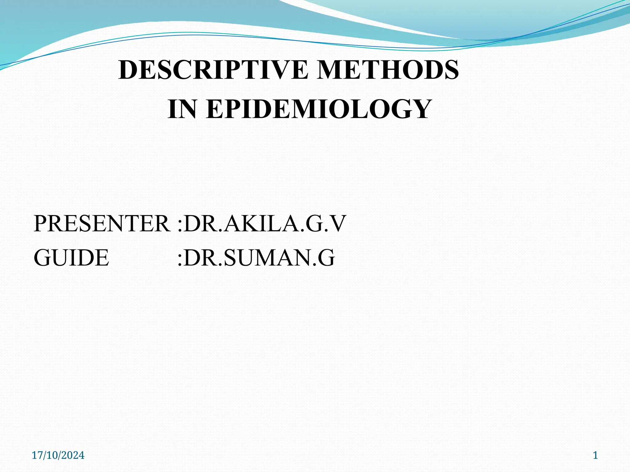 The document discusses descriptive methods in epidemiology, highlighting the definition, history, and types of descriptive studies, along with their characteristics, merits, and limitations. It emphasizes the importance of descriptive studies as preliminary investigations that describe health status within populations, focusing on person, place, and time variables. The document also covers the various study designs and concludes that descriptive studies are vital for understanding disease distribution and aiding in further analytical research.