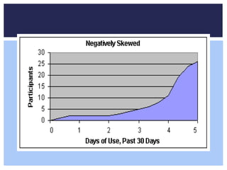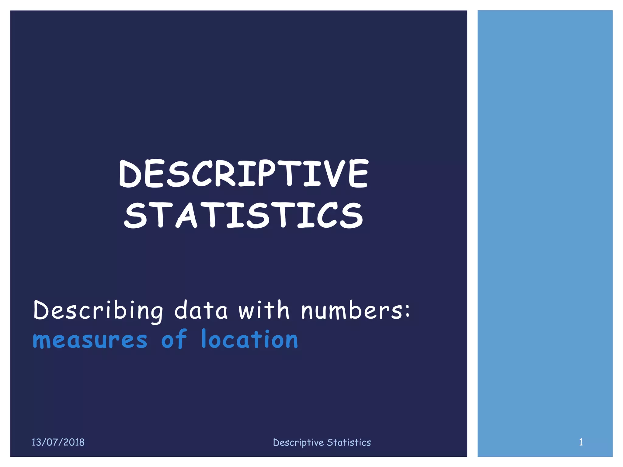 This document provides an overview of descriptive statistics. It discusses different types of descriptive statistics including measures of central tendency like mean, median and mode, and measures of variability. It also describes various ways of organizing and summarizing data, such as frequency distributions, histograms, stem-and-leaf plots and pie charts. The goal of descriptive statistics is to describe key characteristics of a data set in a simple and easy to understand way.
