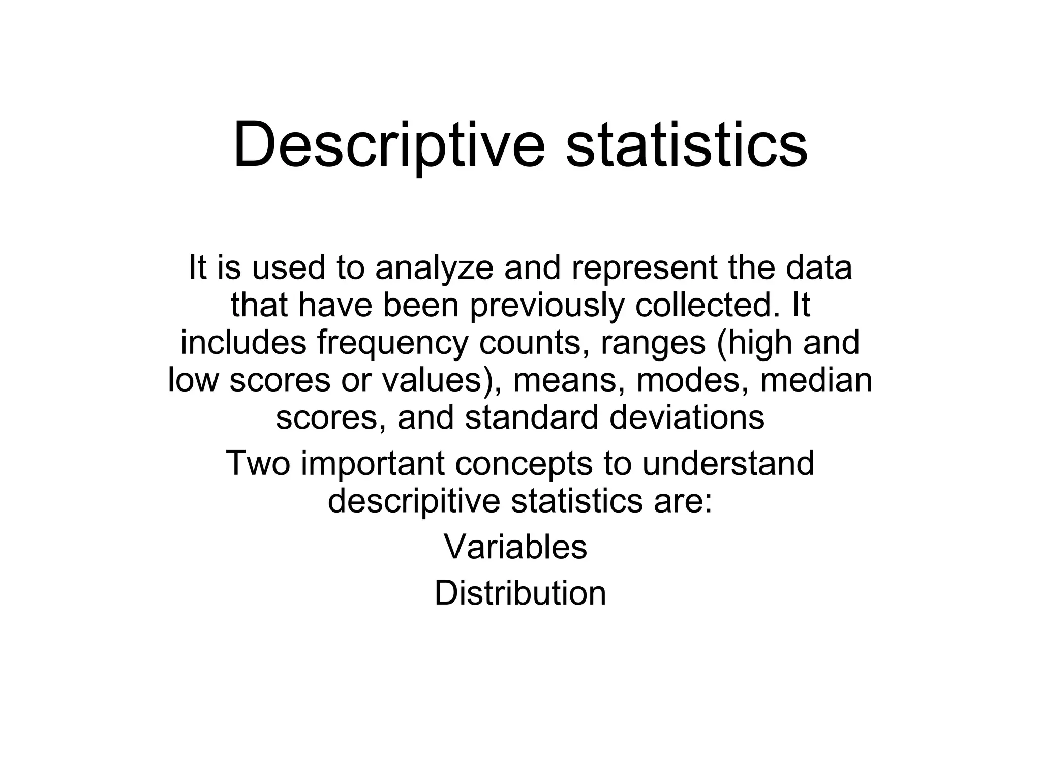 This document discusses descriptive and inferential statistics. Descriptive statistics are used to analyze and represent previously collected data through measures like frequency, range, mean, mode, and standard deviation. Variables can be nominal, ordinal, or interval. Inferential statistics are used to draw conclusions and make predictions based on descriptive statistics. Key concepts in inferential statistics include experiments, probability, population, sampling, and hypothesis testing.
