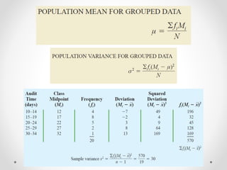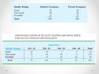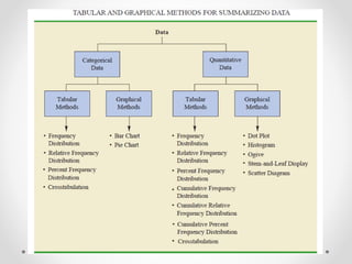 This document provides an overview of descriptive statistics techniques for summarizing categorical and quantitative data. It discusses frequency distributions, measures of central tendency (mean, median, mode), measures of variability (range, variance, standard deviation), and methods for visualizing data through charts, graphs, and other displays. The goal of descriptive statistics is to organize and describe the characteristics of data through counts, averages, and other summaries.