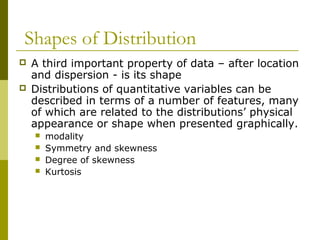 This document discusses various aspects of data distributions including their shape, modality, symmetry, and skewness. It provides definitions and examples of key terms such as: