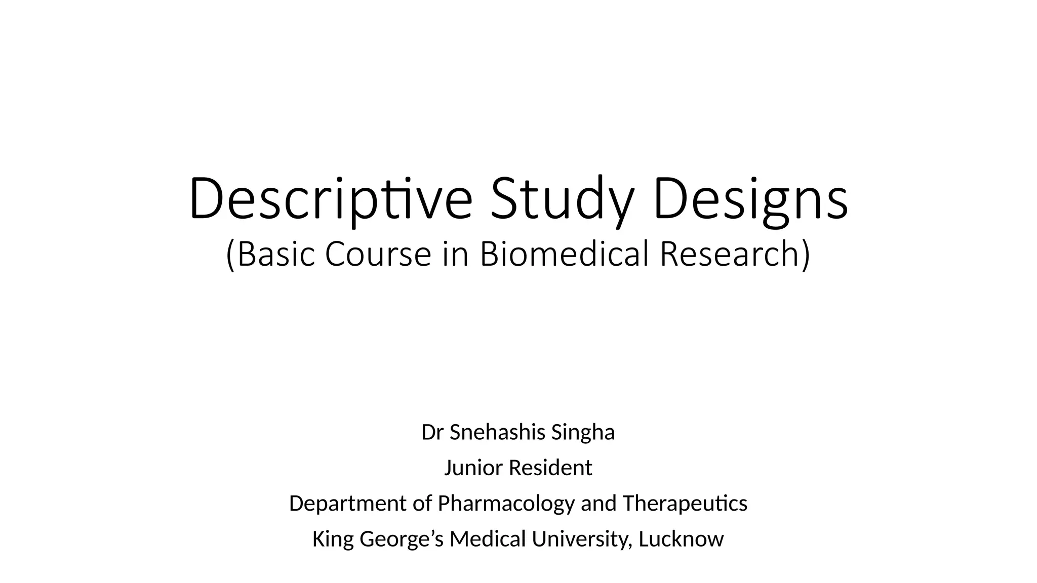 The document provides an overview of descriptive study designs in biomedical research, focusing on case reports, case series, ecological studies, and cross-sectional surveys. These designs help describe health conditions and patterns without establishing causation, offering essential data for health planning and hypothesis generation. Key points include the utility of case reports for documenting rare clinical findings, ecological studies for assessing group-level associations, and cross-sectional surveys for measuring the prevalence of health issues at a specific time.