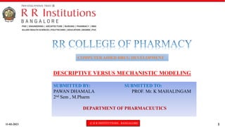 The document discusses two types of models: descriptive models and mechanistic models. Descriptive models describe the overall behavior of a system without explaining the underlying mechanisms, while mechanistic models correspond directly to the real mechanisms in the system. Descriptive models are empirical and based on observation and data, while mechanistic models represent tangible system components and are based on understanding how each part behaves. Both have benefits and challenges for modeling complex systems.