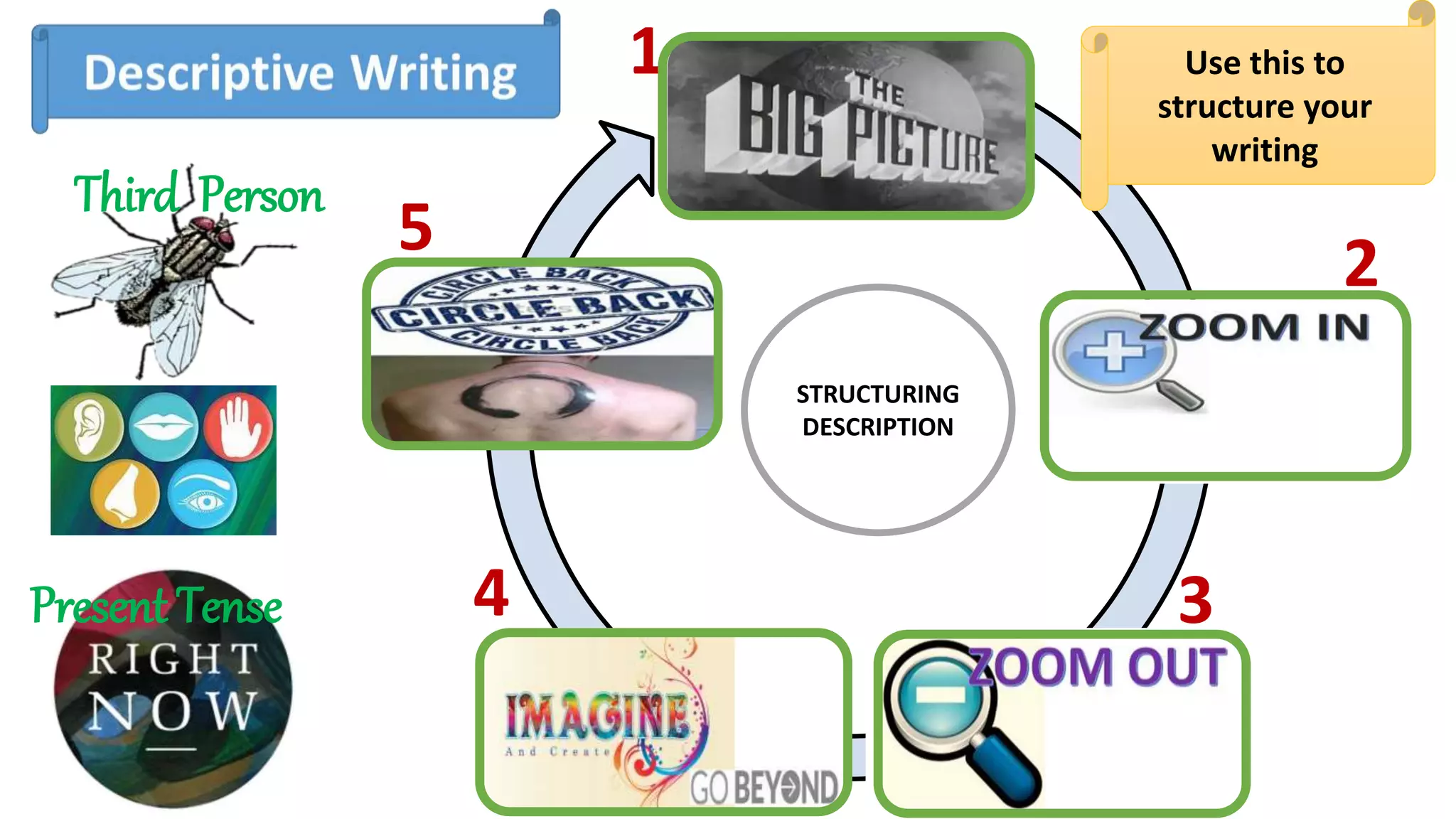The document provides guidance for students on how to structure a descriptive piece of writing about a seaside scene on a sunny day. It recommends using paragraphs and sensory details to describe the beach, sea, sky, and activities of people on the beach. The structure involves starting with an overall impression, zooming in on specific details, and circling back to the opening detail to close the description. Students are given a marking scheme to self-assess their work.