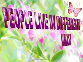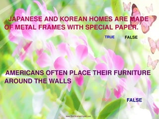 The document discusses different types of homes around the world. It aims to teach students to identify different homes that people live in, such as igloos, wooden houses, and houses on stilts. It describes cultural differences in homes and furnishing styles between places like America, Germany, Japan, Korea, and Iran. Students are asked questions to test their understanding and assigned homework writing about their own homes.