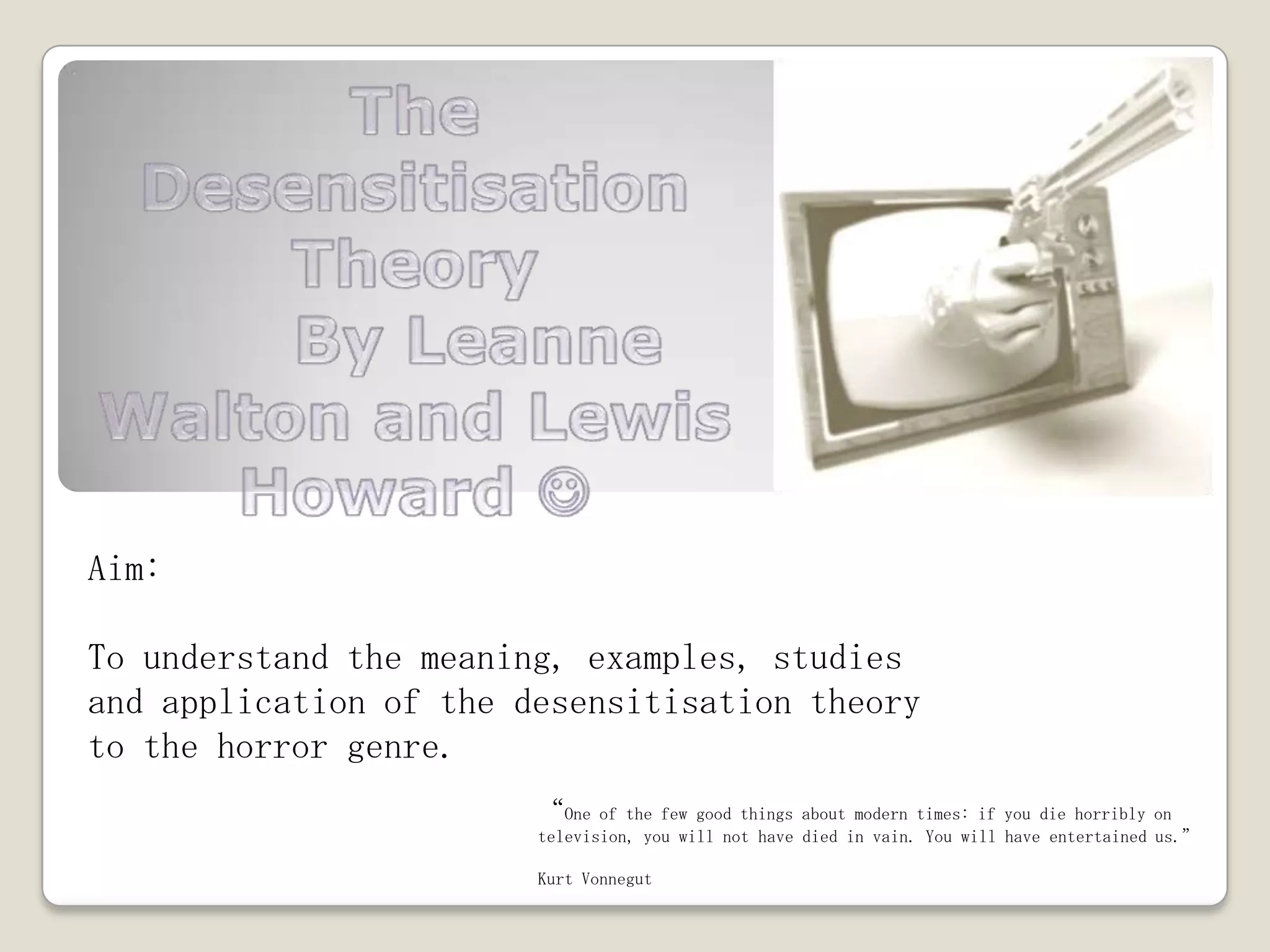 The document discusses the theory of desensitization, where repeated exposure to violence in media can decrease audiences' sensitivity over time. It provides examples of how horror movies have become increasingly graphic, and events like the Columbine shooting intensified debates around media influences. While over-exposure may make people accustomed to fictional violence, real-life impacts are still possible, like mimicking acts seen. The theory is somewhat similar to the hypodermic needle model of direct media effects, but research also shows moderated links between media violence and real aggression.