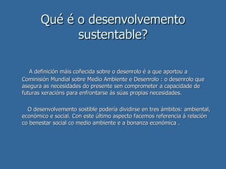 Qué é odesenvolvemento sustentable? A definición máis coñecida sobre o desenrolo é a que aportou a Cominisión Mundial sobre Medio Ambiente e Desenrolo : o desenrolo que asegura as necesidades do presente sen comprometer a capacidade de futuras xeracións para enfrontarse ás súas propias necesidades. O desenvolvemento sostible podería dividirse en tres ámbitos: ambiental, económico e social. Con este último aspecto facemos referencia á relación co benestar social co medio ambiente e a bonanza económica .