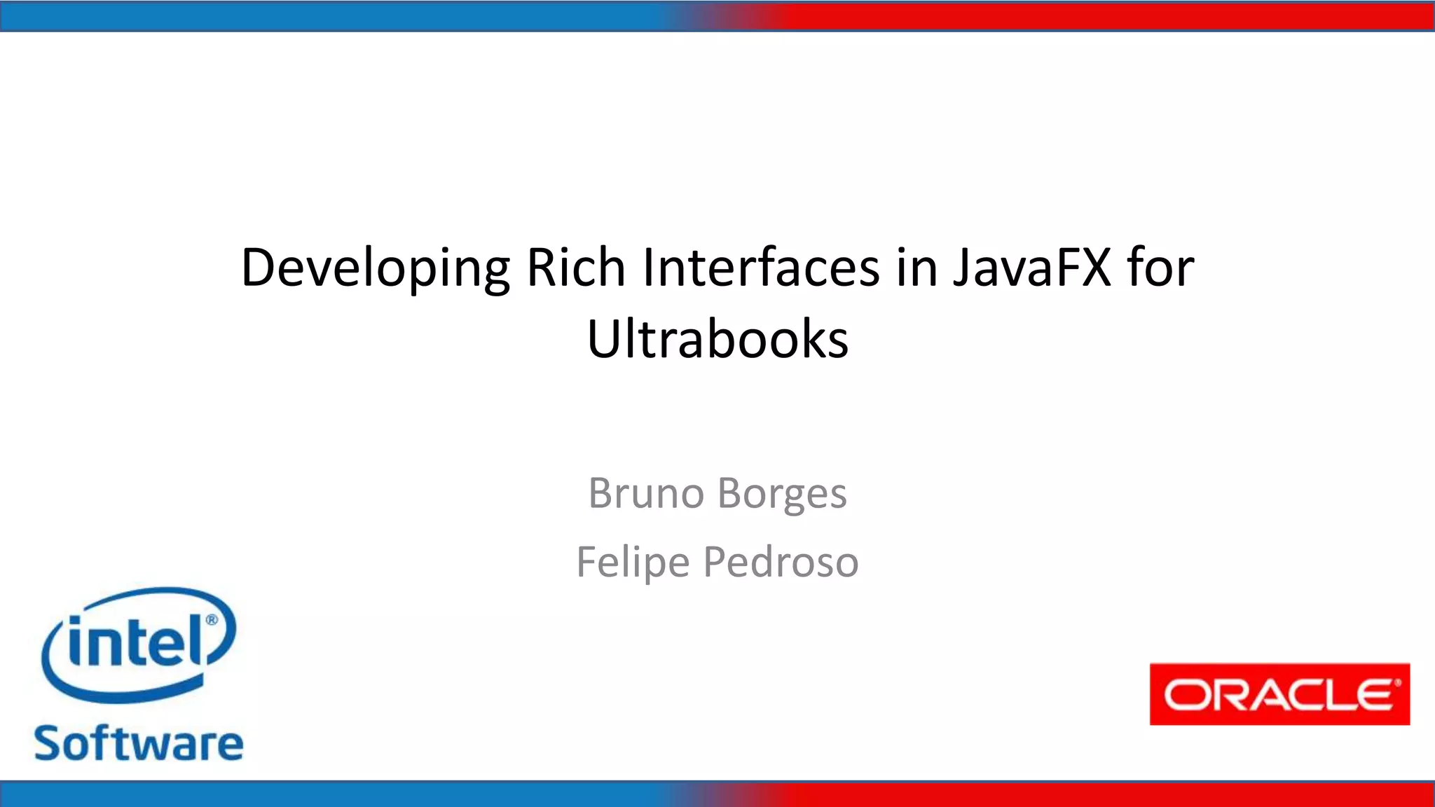 1. The document discusses developing rich interfaces for ultrabooks using JavaFX, which supports touch and gestures. It describes various sensors available on ultrabooks like accelerometers, gyroscopes, and ambient light sensors.
