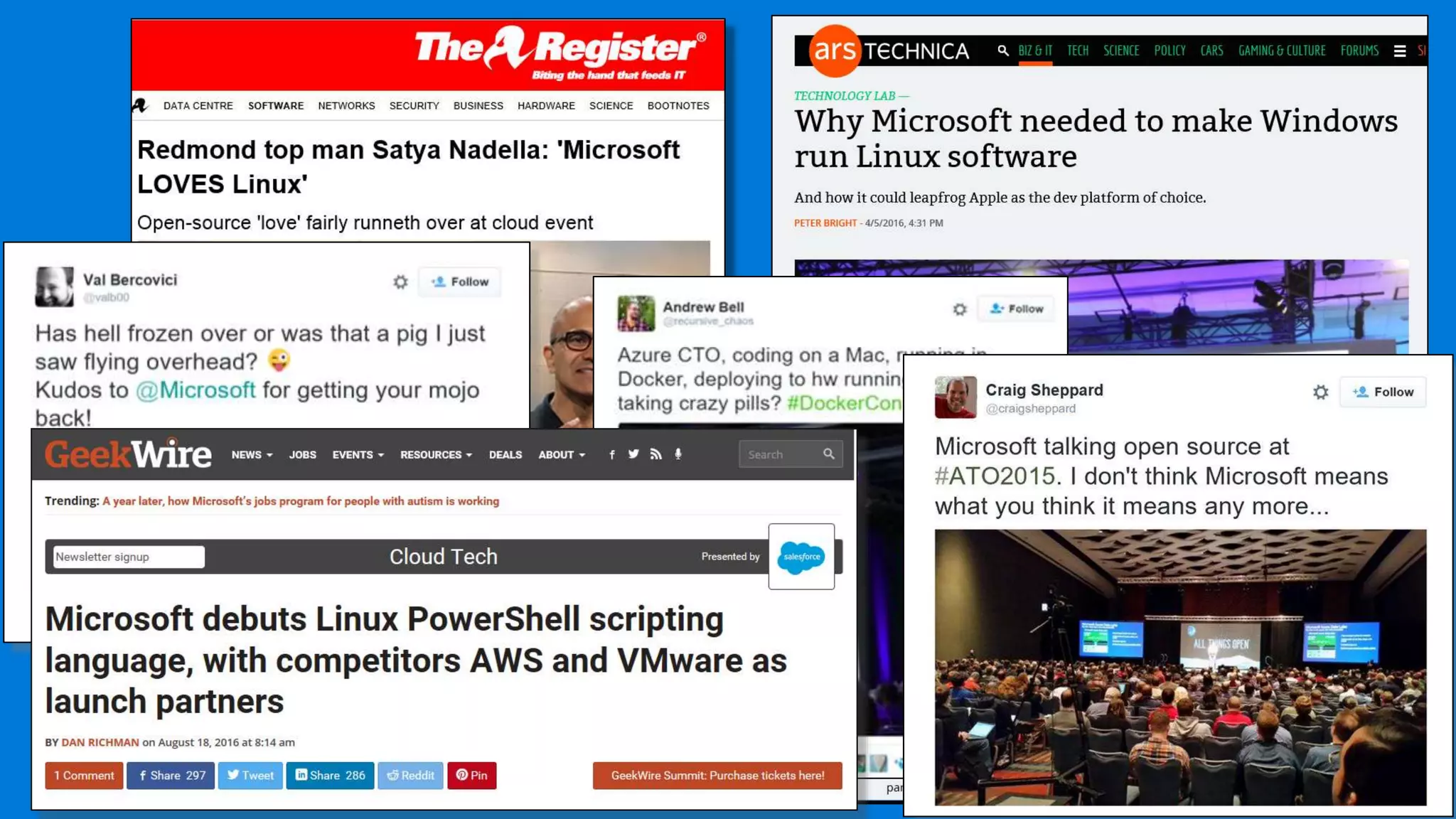 The document highlights advancements in Microsoft Azure, particularly regarding Linux integration and open-source initiatives, such as the availability of PowerShell on Linux and the increasing deployment of Linux virtual machines. It emphasizes the growth in Azure container customers and ongoing community contributions, alongside resources for developing applications using modern frameworks like Angular 2 with TypeScript. Additionally, it details the management capabilities of multiple operating systems, including Linux and Unix, through System Center operations management.
