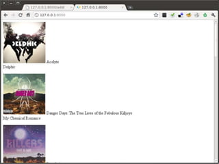 The document describes building a web application for managing an album collection using the Django web framework. It shows how to create a Django project and app, define a model for albums, build forms and views to add, display, and delete albums. Templates are used to display the form and album listing. The application allows users to add albums with details, see a list of all albums, and delete albums from the collection.