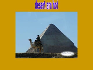 The document discusses desert environments, noting that they are hot places with limited rainfall of less than 10 inches that support cacti plants and nocturnal animals like scorpions. Locations of deserts are also mentioned but not specified.