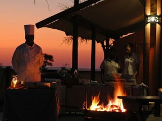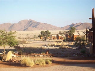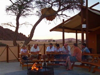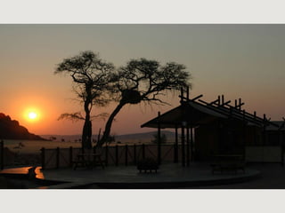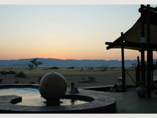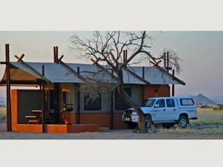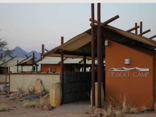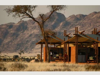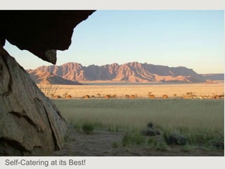 The document describes a self-catering establishment with 20 fully equipped units, offering magnificent views suitable for photographers and nature lovers. It provides various meal options, including bringing supplies, ordering from reception, dining at a nearby lodge, or hiring a private chef. Amenities include en-suite bathrooms, wheelchair-accessible units, and communal facilities like a pool and bar.