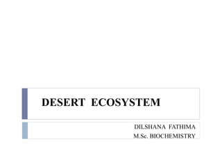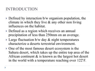 This document summarizes key aspects of desert ecosystems. It describes deserts as regions that receive less than 250mm of annual precipitation and experience large fluctuations in day and night temperatures. The four main types of deserts - hot, semi-arid, coastal, and cool - are outlined based on their temperature and precipitation patterns. Adaptations that allow plants and animals to survive the arid conditions, such as thickened stems and burrowing, are also summarized. Finally, the document provides an example of the Imperial Valley, which has been transformed from desert land into a productive farming region through irrigation.