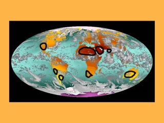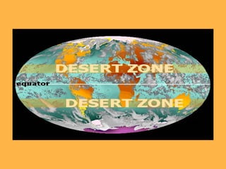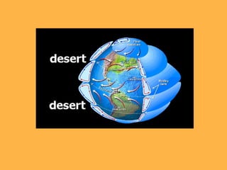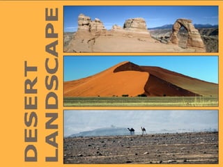 White Sands National Monument in New Mexico, Wadi Dhar in Yemen, and Dead Vleii in the Namib Desert are provided as examples of desert locations. Deserts are defined as areas receiving less than 250mm of annual precipitation, or less than 100mm for extreme deserts. Deserts experience large daily temperature fluctuations. Common desert landforms include hamadas (rock deserts), ergs (sand deserts), stony deserts, playas (dry lake beds), wadis (dry river beds), and bajadas (alluvial fans). Desert vegetation is xerophytic or drought-resistant, with small, twisted leaves and stomata that only open at night. Perenn