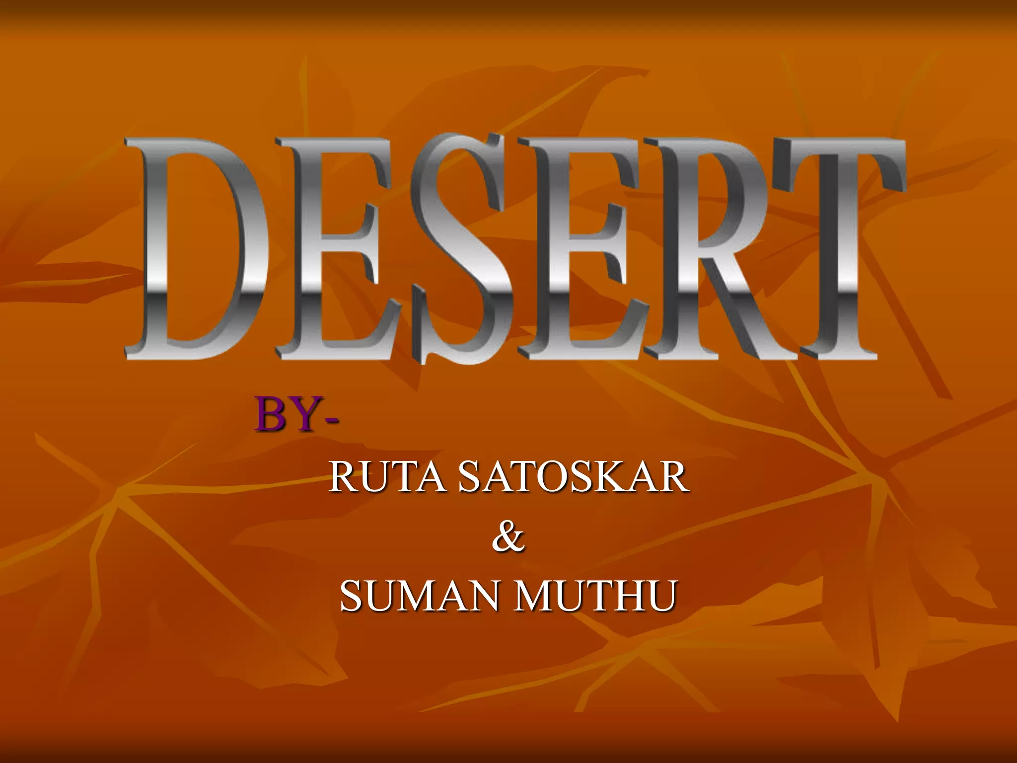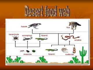 The document discusses the characteristics of desert ecosystems, including their climate, plants, animals, seasons, and human impacts. Deserts have hot or cold climates, with hot deserts receiving less than 10 inches of rain annually. Many desert plants and animals have adaptations like water storage or nocturnal behavior to survive the dry, hot conditions. Seasons are warm year-round with little rainfall. Humans threaten desert ecosystems through activities like poaching, road building, and desertification.