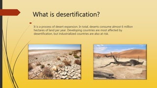 Desertification is the process of desert expansion caused by climate change and human activities like deforestation and inadequate farming methods. It leads to a reduction in agricultural land and increases soil erosion, salinity, dust storms and carbon dioxide emissions while destroying ecosystems. Countries try to reduce desertification through practices like prohibiting deforestation, afforestation, irrigation, and planting vegetation.