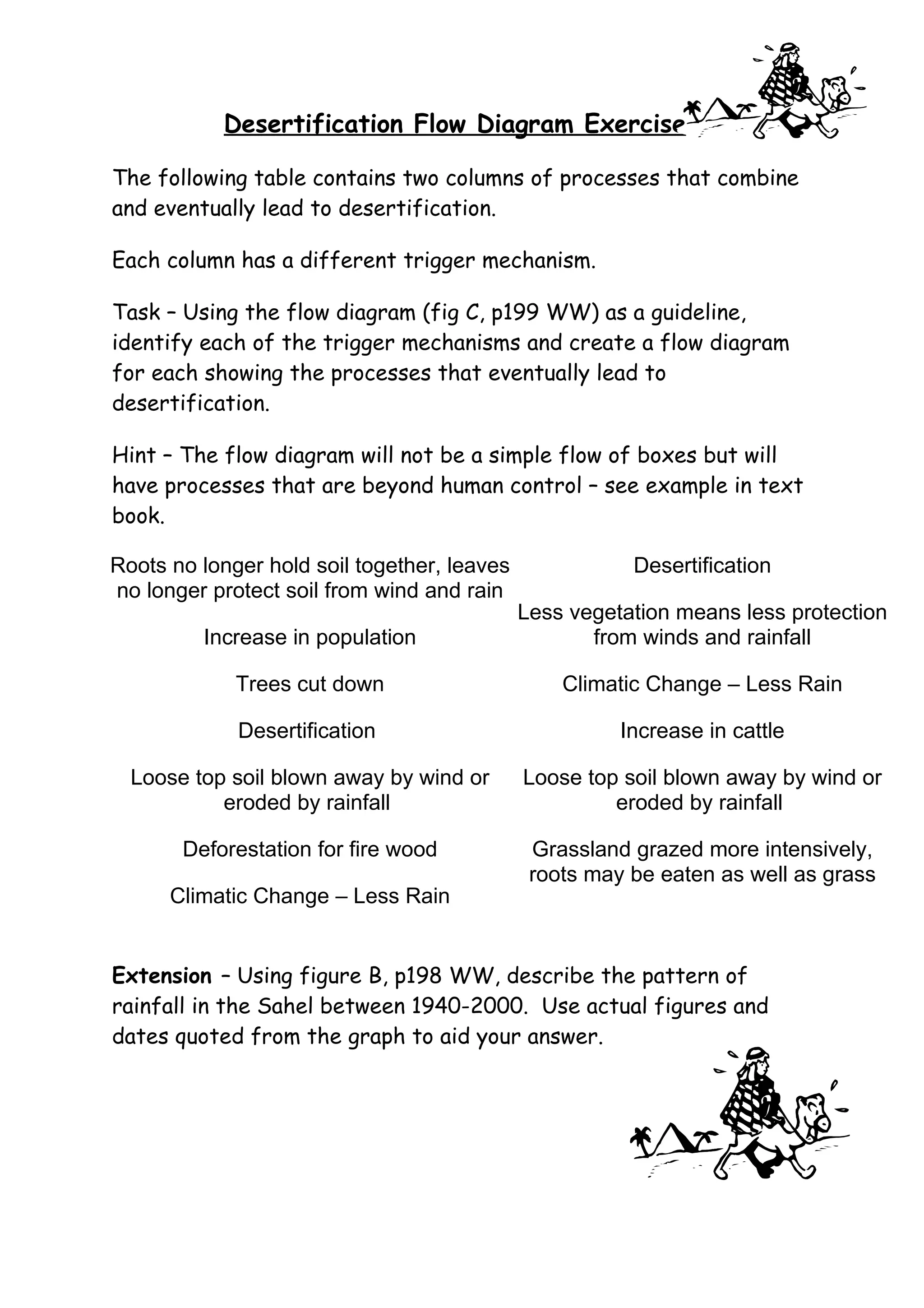 The document provides a flow diagram exercise that asks students to identify two trigger mechanisms that can lead to desertification based on columns listing processes. Students are asked to create flow diagrams for each trigger mechanism showing how the processes eventually result in desertification, referring to an example diagram in their textbook. The document also provides a hint about the nature of the diagrams and an extension question about rainfall patterns in the Sahel region based on a figure from the textbook.