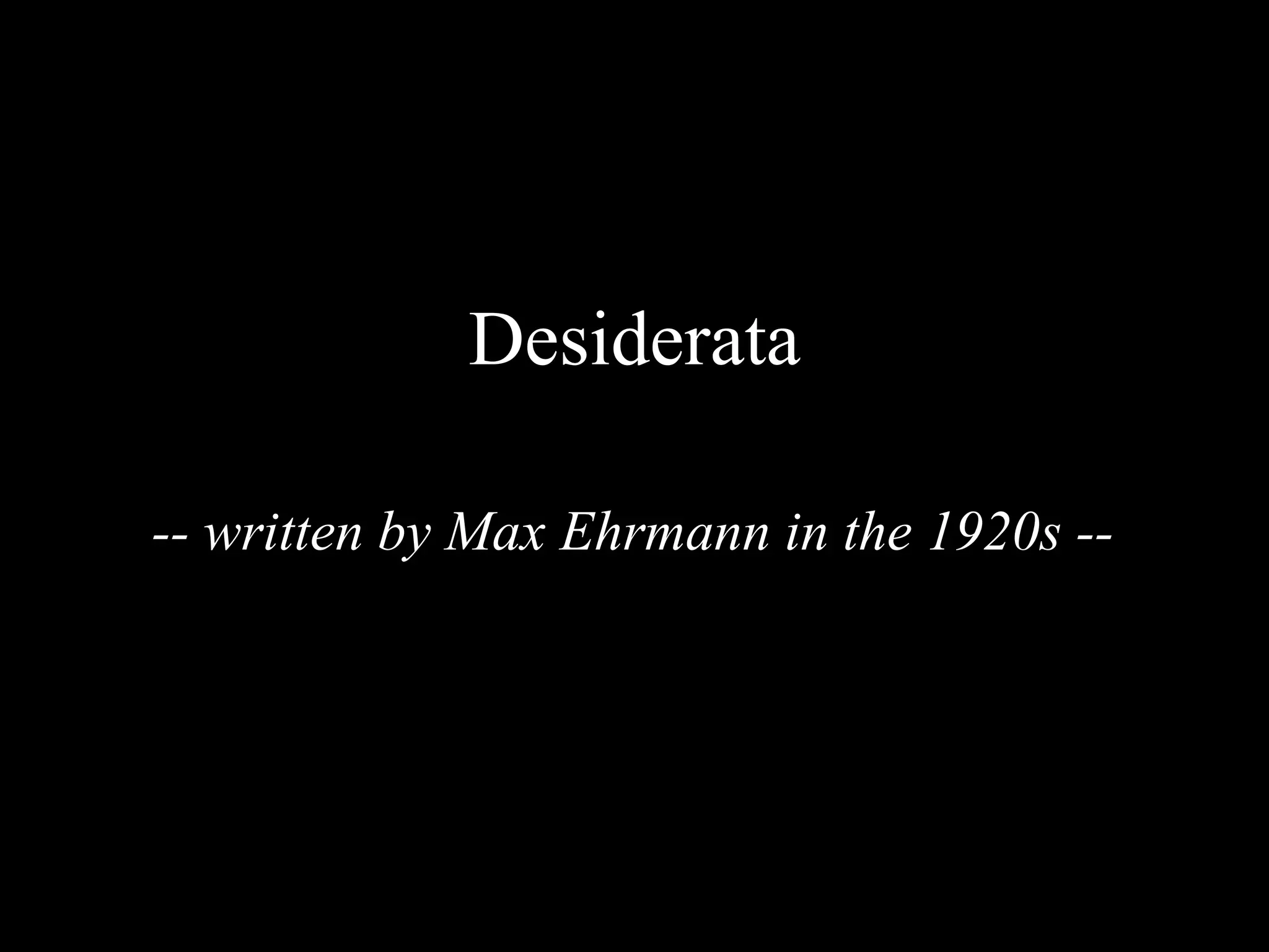 The poem Desiderata provides life advice on remaining calm, being kind to others, avoiding cynicism and comparisons, nurturing strength of spirit, accepting counsel from experience, and finding peace and happiness despite life's difficulties.