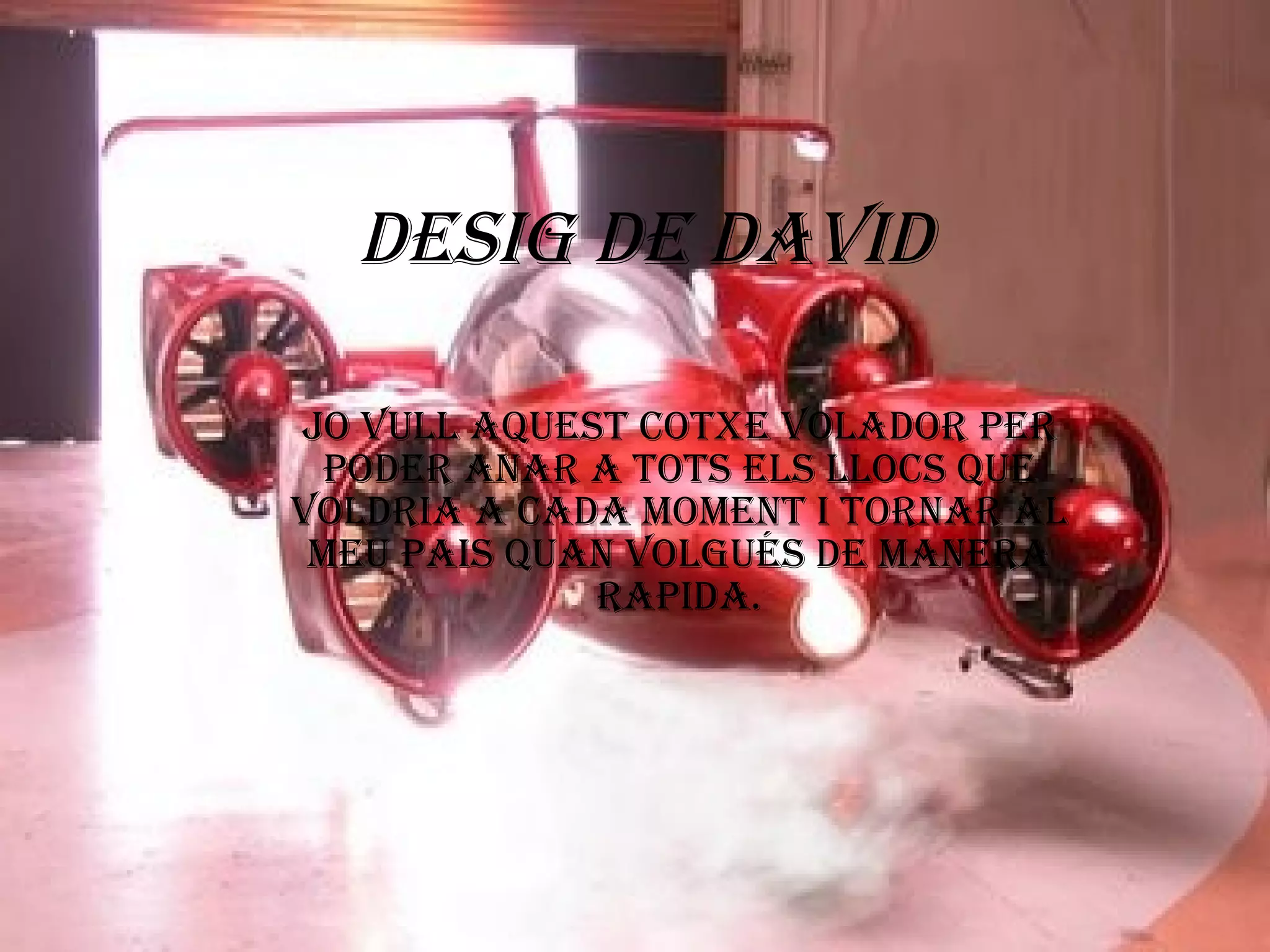 Desig David Alias Dangero 1. DESIG DE DAVID JO VULL AQUEST COTXE VOLADOR PER PODER ANAR A TOTS ELS LLOCS QUE VOLDRIA A CADA MOMENT I TORNAR AL MEU PAIS QUAN VOLGUÉS DE MANERA RAPIDA.