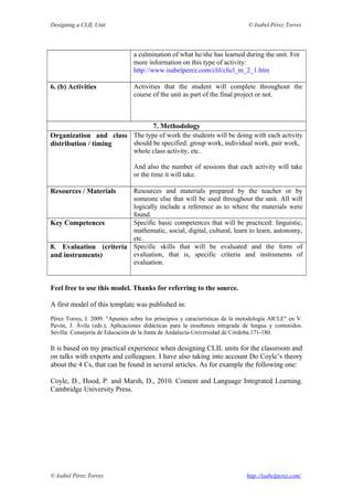 This document provides a template for designing a CLIL (Content and Language Integrated Learning) didactic unit. The template includes 8 sections for planning the unit: 1) learning outcomes and evaluation criteria, 2) subject content, 3) language content and communication, 4) cultural/contextual elements, 5) cognitive processes, 6) tasks and activities, 7) methodology and organization, and 8) evaluation criteria and instruments. The template is meant to help integrate language learning with content learning for a given subject. References are provided to further resources on CLIL methodology and theory.