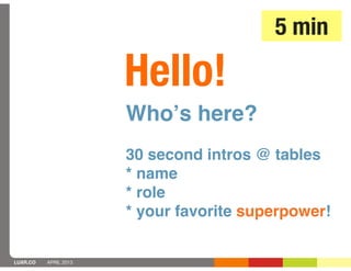 This document summarizes a workshop on designing a passion product using lean startup methods in 3 hours. The workshop covered defining users and their needs through personas and brainstorming uses and features. It emphasized the importance of rapidly prototyping and testing ideas to validate assumptions. Participants worked in pairs to develop a product narrative, dashboard of metrics, and 3-minute pitch for a minimum viable product. The goal was to have an initial concept that could be built upon after validating it with potential customers.