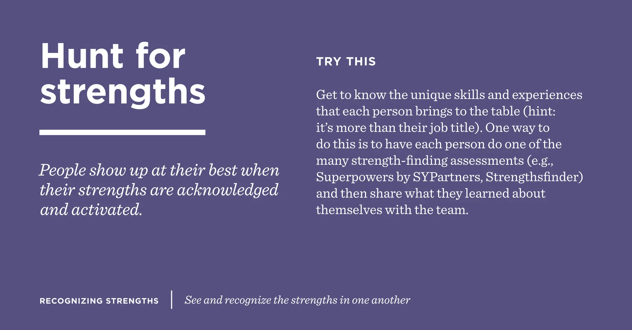 The document emphasizes the importance of recognizing and activating individual strengths within a team to enhance performance and collaboration. It suggests utilizing strength-finding assessments, expressing gratitude in team meetings, and supporting new team members to develop their skills. Additionally, it encourages team members to connect their personal purpose with their work to maximize their impact and engagement.