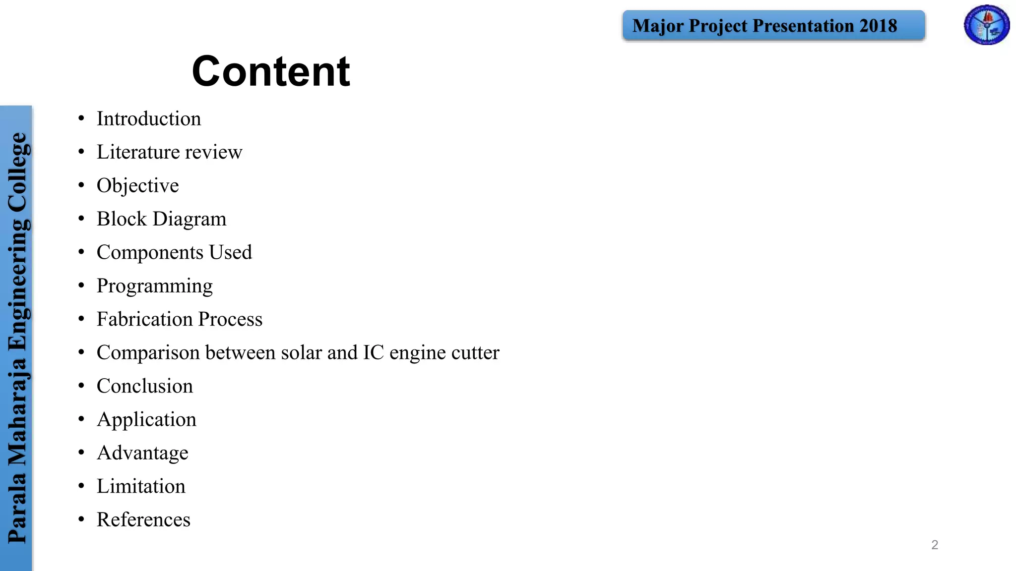 The document summarizes a student project to design and fabricate an automated solar-powered lawn mower. It includes an introduction describing the motivation to reduce noise and air pollution from gas-powered mowers. It then outlines the objectives, components, programming, and fabrication process. The components include a solar panel, battery, motors, blades, and an Arduino board. It is programmed using Arduino code and assembled on a chassis. The project aims to provide an environmentally friendly alternative to gas-powered lawn mowers.