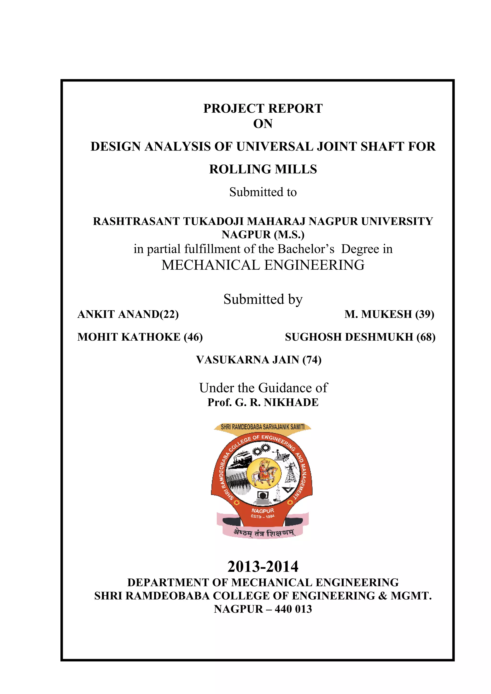 This project report presents a design analysis of a universal joint shaft for rolling mills, submitted by a group of mechanical engineering students at Shri Ramdeobaba College of Engineering & Management during the 2013-2014 academic year. It discusses the structure, advantages, and applications of universal joints, supported by a literature review on their historical development and mathematical analysis. The document includes chapters detailing the project methodology, validation of results, and future scope, alongside acknowledgments for instructional and technical support.