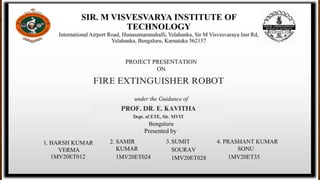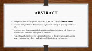 The project aims to design a fire extinguisher robot capable of autonomously detecting and extinguishing fires in hazardous environments, utilizing various sensors, a water tank, and a microcontroller for navigation and obstacle avoidance. The development process includes system design, hardware and software development, integration and testing, followed by real-world deployment and evaluation. The robot is intended for use in areas where human firefighters cannot safely operate, such as tunnels and industrial sites.