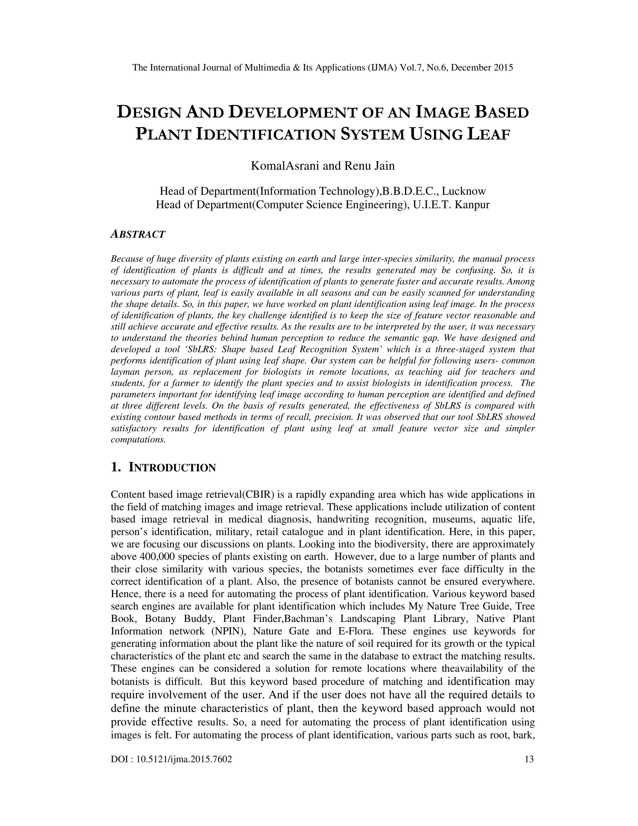 The document discusses the design and development of an automated plant identification system called SBLRS (Shape Based Leaf Recognition System), which utilizes leaf shape for identification. The system addresses the challenges of plant diversity and inter-species similarity by providing an efficient method for recognizing over 400,000 plant species using image processing techniques. It outlines the need for automating plant identification, the methodology for generating feature vectors based on leaf characteristics, and compares SBLRS's effectiveness with existing contour-based methods.