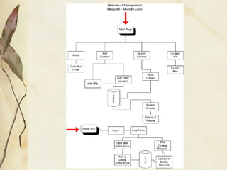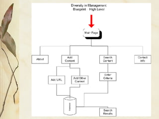 The document discusses various tools and methods for representing information architecture (IA), including blueprints, wireframes, content mapping, content modeling, controlled vocabularies, design sketches, and web-based prototypes. It provides examples and guidelines for each method. Key tools include blueprints for site maps, wireframes for page layouts, content mapping for organizing content, and controlled vocabularies for standardizing terms. The goal is to effectively communicate the IA to audiences and production teams.
