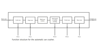 This document outlines the design process and principles in engineering, covering modules that include design thinking approaches, communication, engineering concepts, and the importance of market analysis. It emphasizes the iterative nature of design, addressing challenges like understanding customer needs, ethical considerations, and historical design failures. Additionally, it discusses practical applications such as creating an automatic aluminum can crusher, highlighting necessary features and market research.
