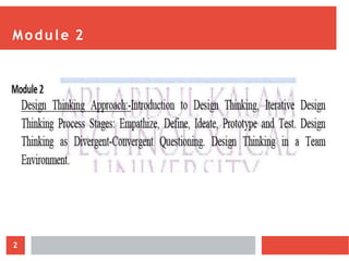 The document introduces design thinking as a human-centered approach to creative problem-solving, emphasizing empathy, ideation, and experimentation as its core pillars. It outlines a five-step process consisting of empathize, define, ideate, prototype, and test, which can occur in a non-linear fashion. Additionally, it distinguishes between divergent thinking for brainstorming multiple solutions and convergent thinking for selecting the best solution efficiently.