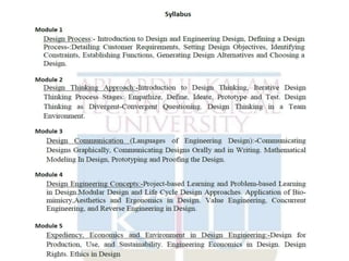 The document provides information about a course on design and engineering. It outlines the course objectives, which are to introduce students to fundamental design principles, the design process, and basic design tools. The course outcomes are for students to be able to explain design concepts and principles, apply design thinking, and develop innovative and sustainable designs. It then discusses various aspects of design such as what design is, engineering design principles, the differences between engineering design and other types of design. It also outlines the steps in the engineering design process.