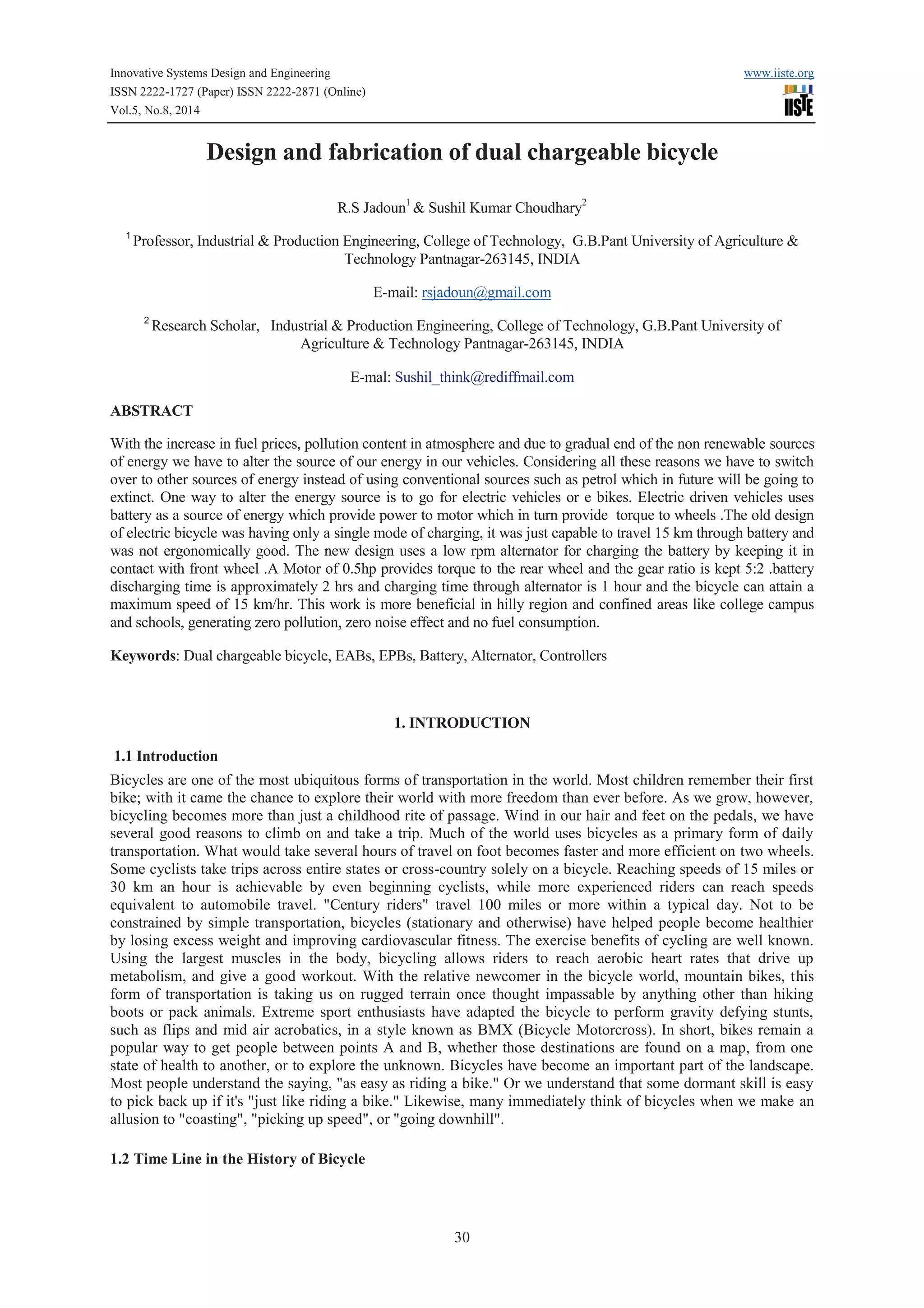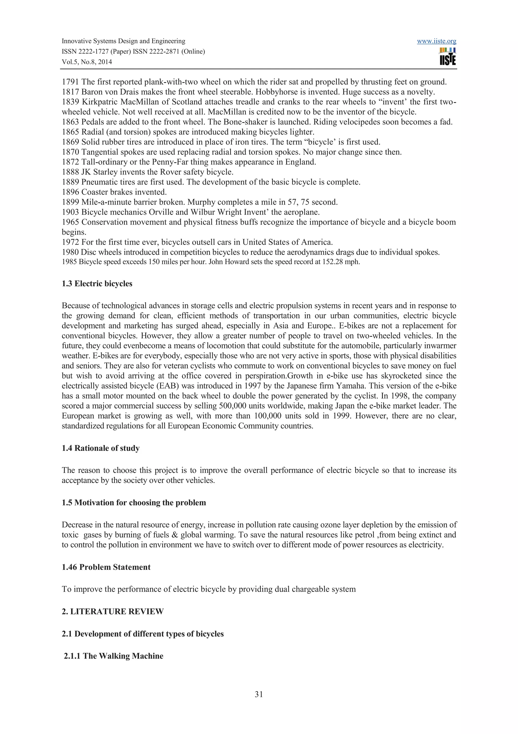 The document discusses the design and fabrication of a dual chargeable electric bicycle aimed at reducing reliance on fossil fuels and minimizing pollution. It highlights advancements in electric vehicle technology, detailing features like a low RPM alternator for battery charging and specifications of the bicycle's motor and speed capabilities. The study emphasizes the bicycle's potential benefits in urban environments and hilly regions, promoting it as a more sustainable transportation alternative.