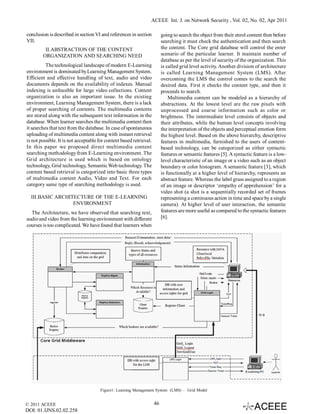 This document discusses the design and implementation of an efficient search methodology for content-based retrieval in e-learning environments, focusing on multimedia data such as images, audio, and video. The proposed algorithm aims to improve the retrieval speed and efficiency of multimedia content through a grid architecture and offers a structured approach to content organization and retrieval operations. The results indicate satisfactory efficiency in searching and retrieving multimedia content in e-learning systems.