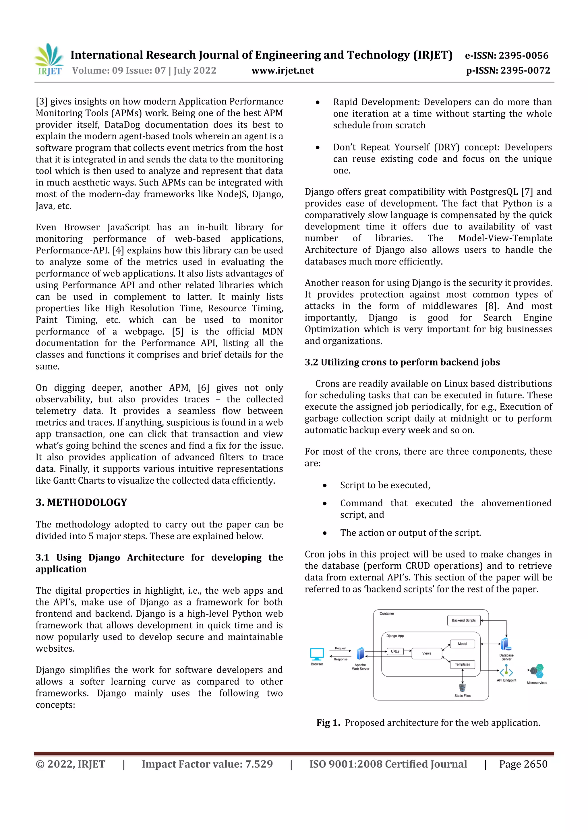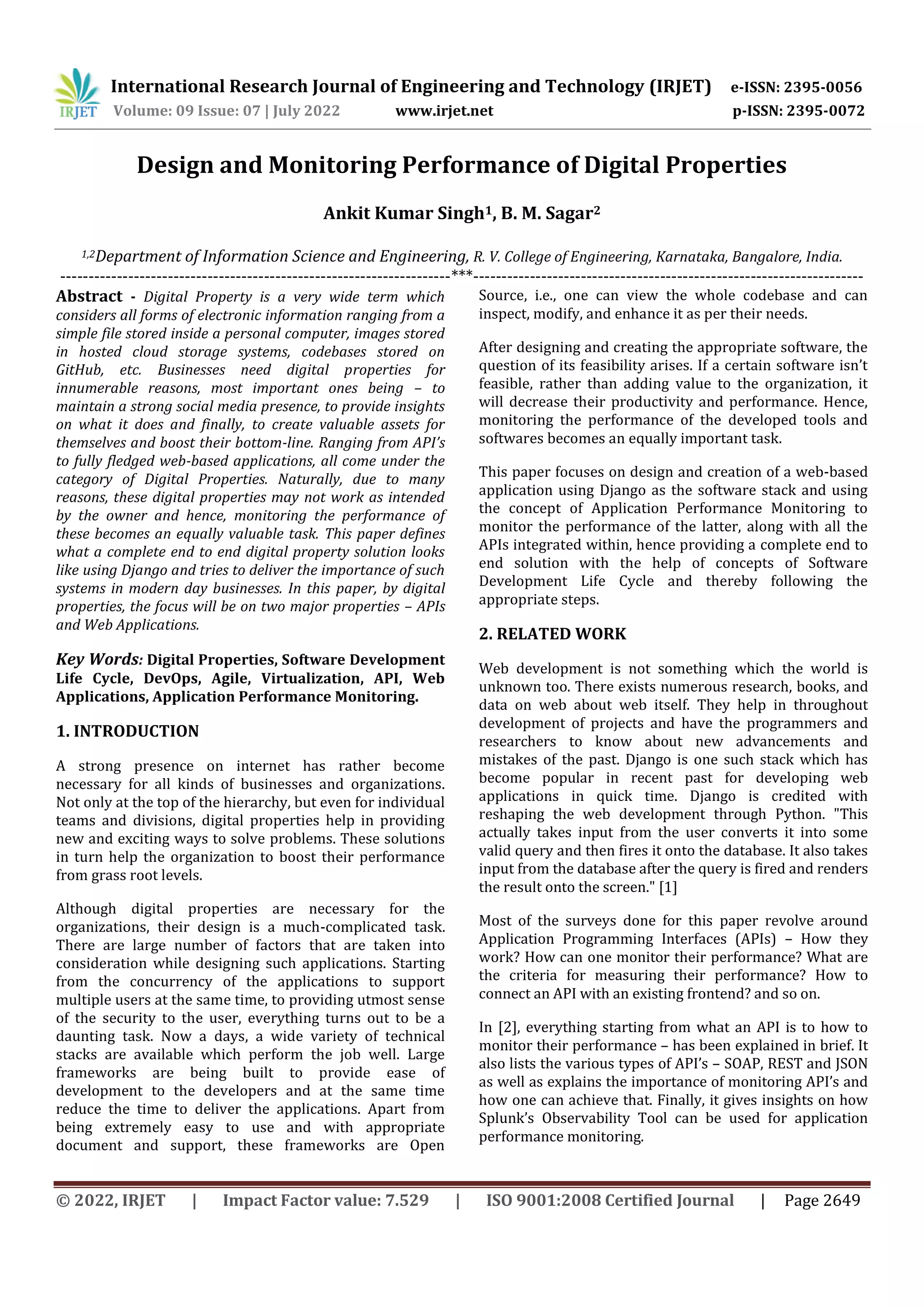 This document discusses the design and monitoring of digital properties such as web applications and APIs. It proposes using the Django framework to develop a web application and integrate APIs. It describes using cron jobs to perform backend tasks and external libraries for the frontend. An Elastic agent would be installed to monitor application performance on Kibana dashboards. This provides an end-to-end solution for developing, integrating, and monitoring digital properties using open source tools.