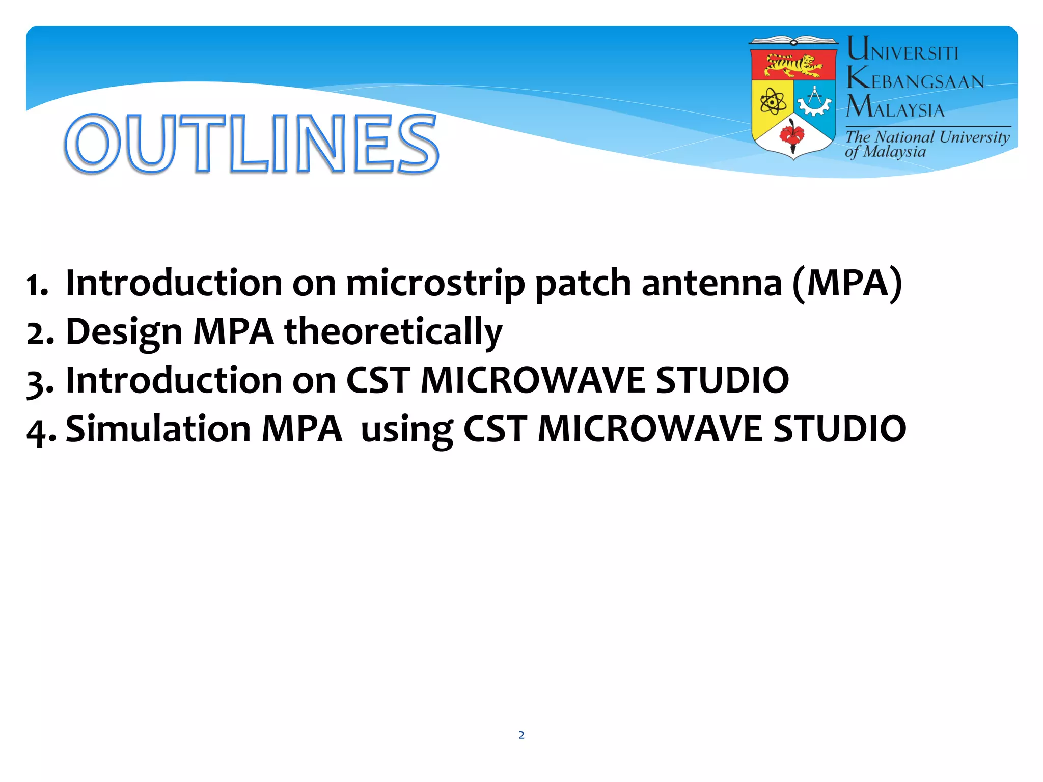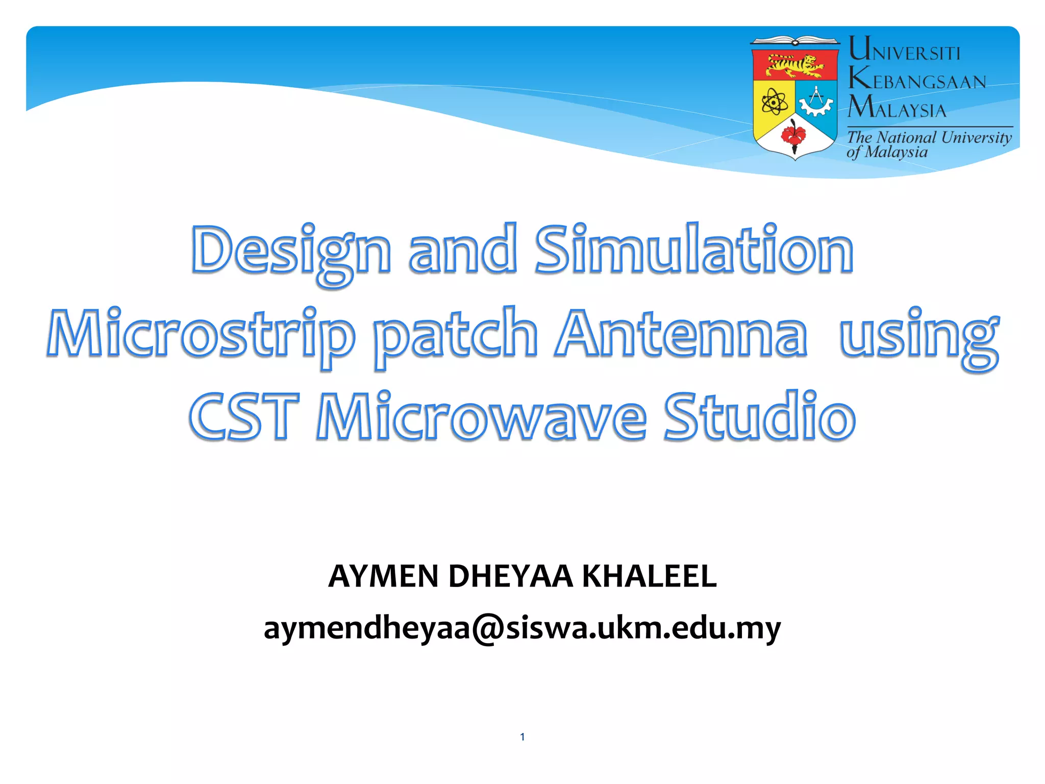 The document describes the design and simulation of a microstrip patch antenna in CST Microwave Studio. It begins with an introduction to microstrip patch antennas and their applications. Then, it outlines the theoretical design of a rectangular patch antenna for 2.4 GHz WiFi using transmission line equations. Finally, it details the simulation process in CST Microwave Studio, including adding the patch, feedline, substrate and ground plane, assigning materials and frequencies, setting up the port and monitors, and solving to obtain results like the bandwidth and radiation pattern.