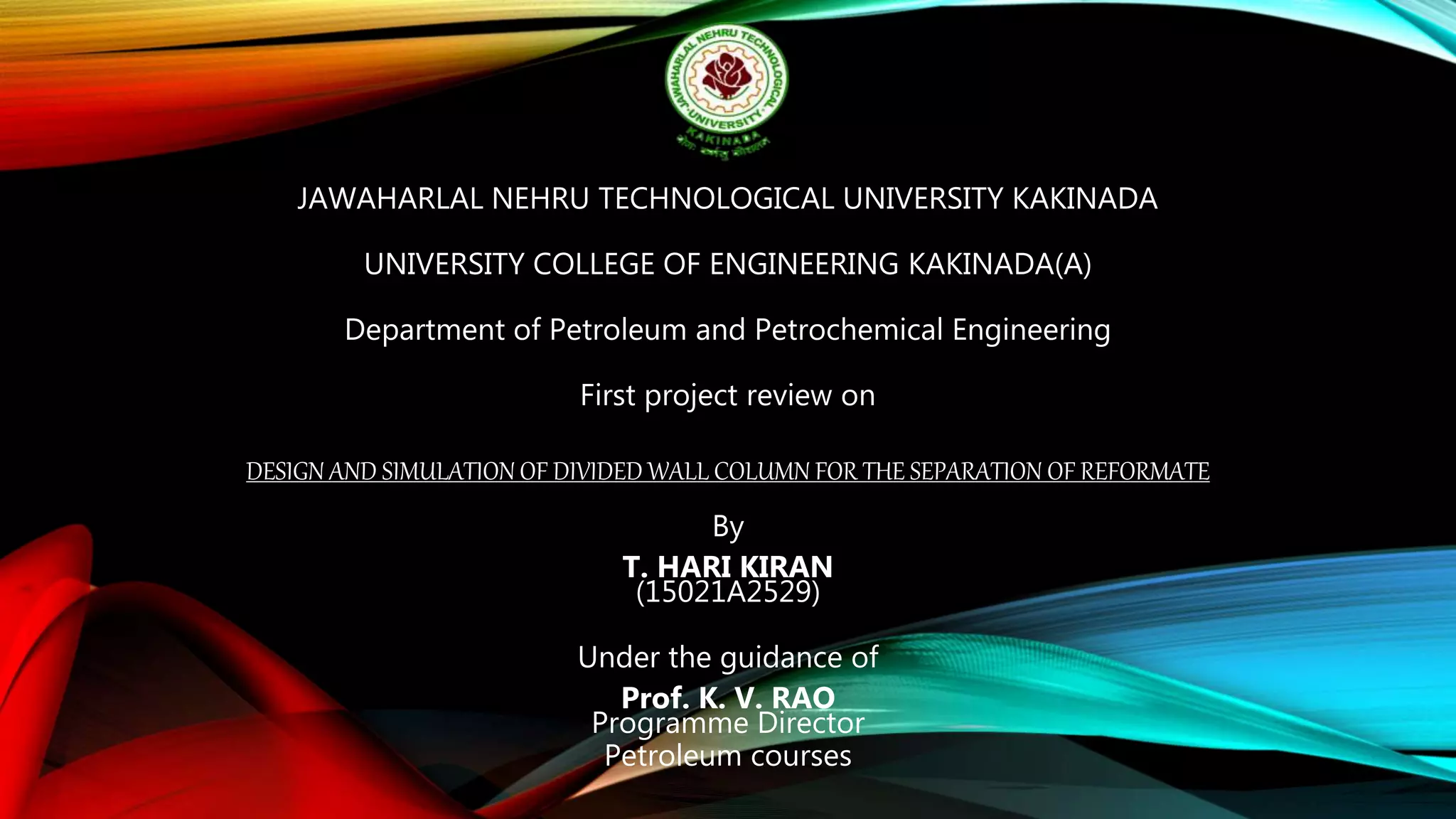 This document provides an overview of a student project to simulate the design of a divided wall column for separating reformate. Reformate is a mixture of hydrocarbons including benzene, toluene, xylene, and ethylbenzene. A divided wall column can save 20-40% of energy compared to conventional distillation columns. The student will perform material and energy balances, equipment design, and cost estimation to simulate the column. A literature review discusses the history and applications of divided wall columns in chemical plants.