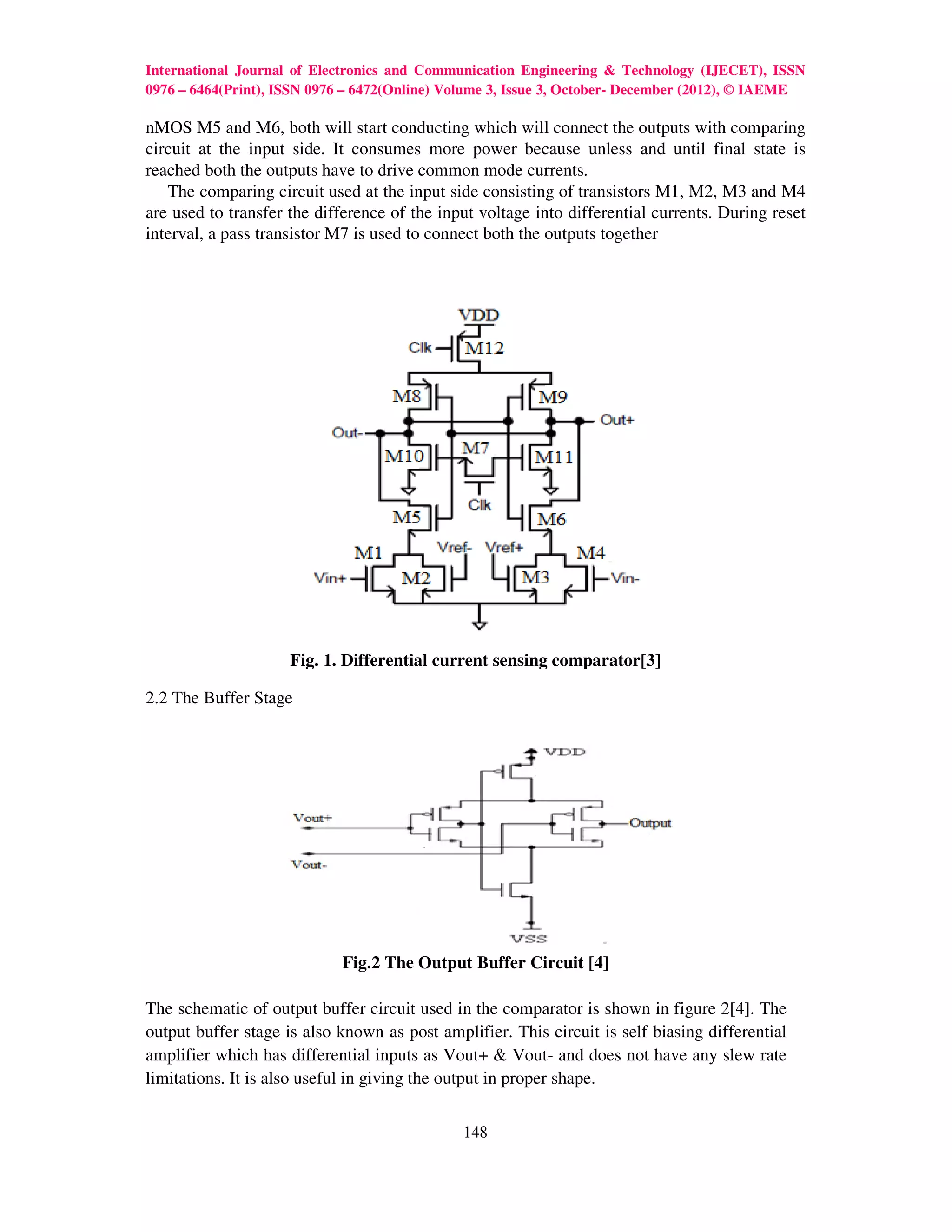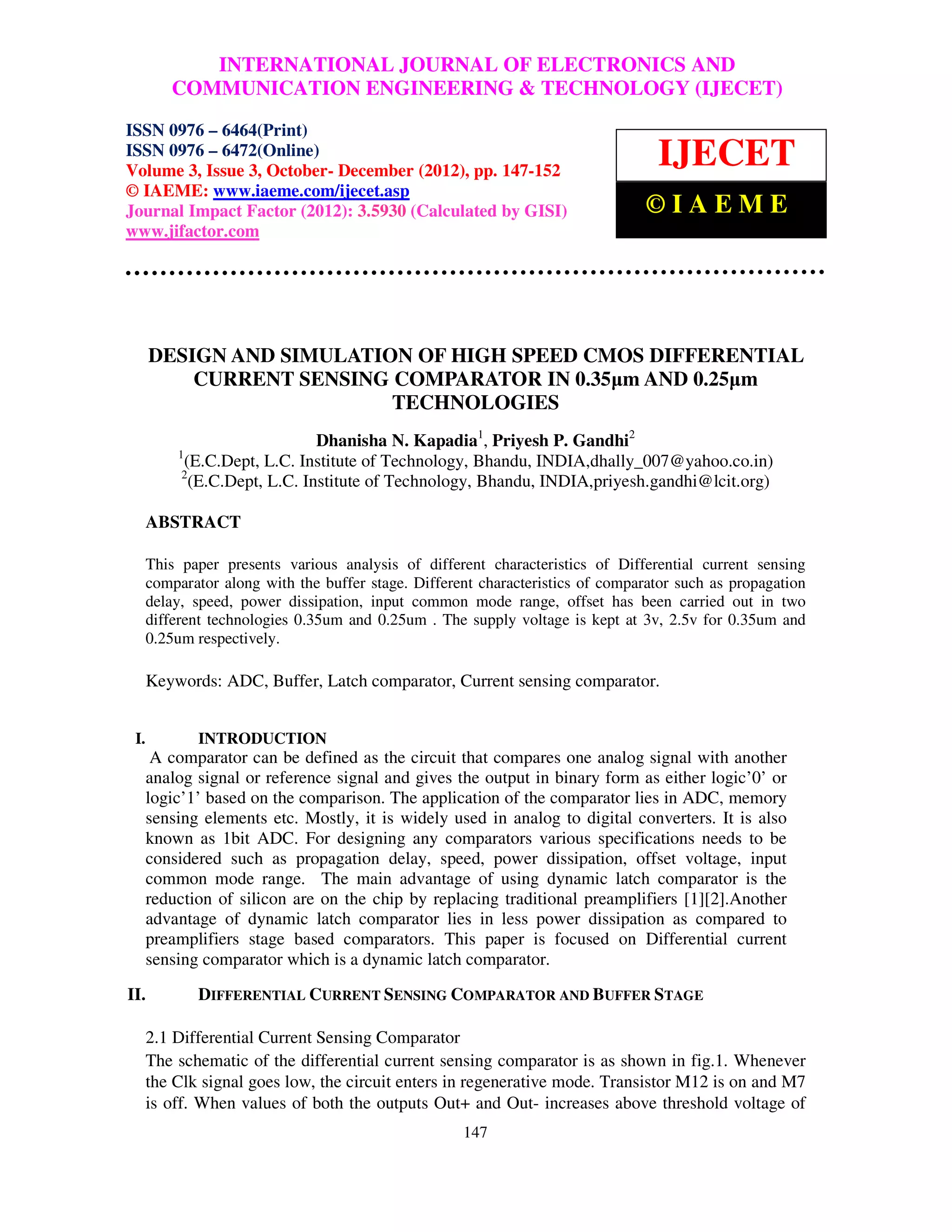 This document discusses the design and simulation of a high-speed CMOS differential current sensing comparator in 0.35μm and 0.25μm technologies. It presents the circuit design of the differential current sensing comparator and output buffer stage. Various performance metrics of the comparator like propagation delay, speed, power dissipation, offset voltage, and input common mode range are analyzed through simulations in the two technologies. The results show improvements in speed, power dissipation, and input common mode range in the 0.25μm technology compared to the 0.35μm technology.