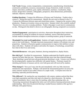 This 5-week unit plan for an 8th grade technology class focuses on design and sketching. Students will learn to identify needs and opportunities for technical solutions, generate alternative solutions, develop plans and construct models. Assessments include formative and summative assessments. Students will apply measurement and sketching skills to real world problems. The teacher found that students understood measurement better but needed more practice with advanced sketching. Changes for next year include starting content immediately and spreading measurement across the entire semester.