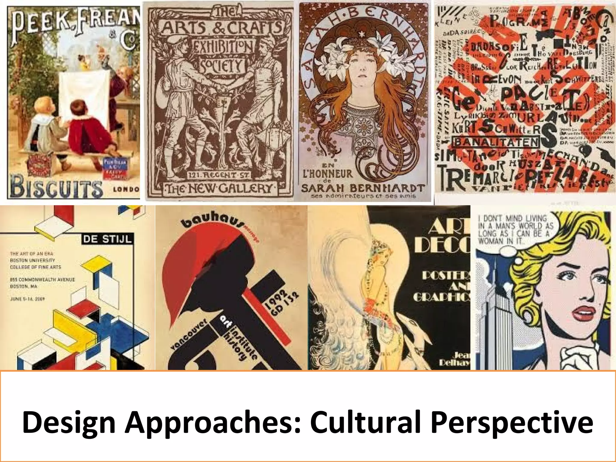 The document outlines various design approaches from the Victorian era (1837–1901) through to the 1990s. It highlights movements such as Arts & Crafts (1860–1910), Art Nouveau (1890), Dada (1916), De Stijl (1917), Bauhaus (1918), and Psychedelic Art (1960s). These movements reflect the evolving cultural perspectives and artistic influences throughout these decades.