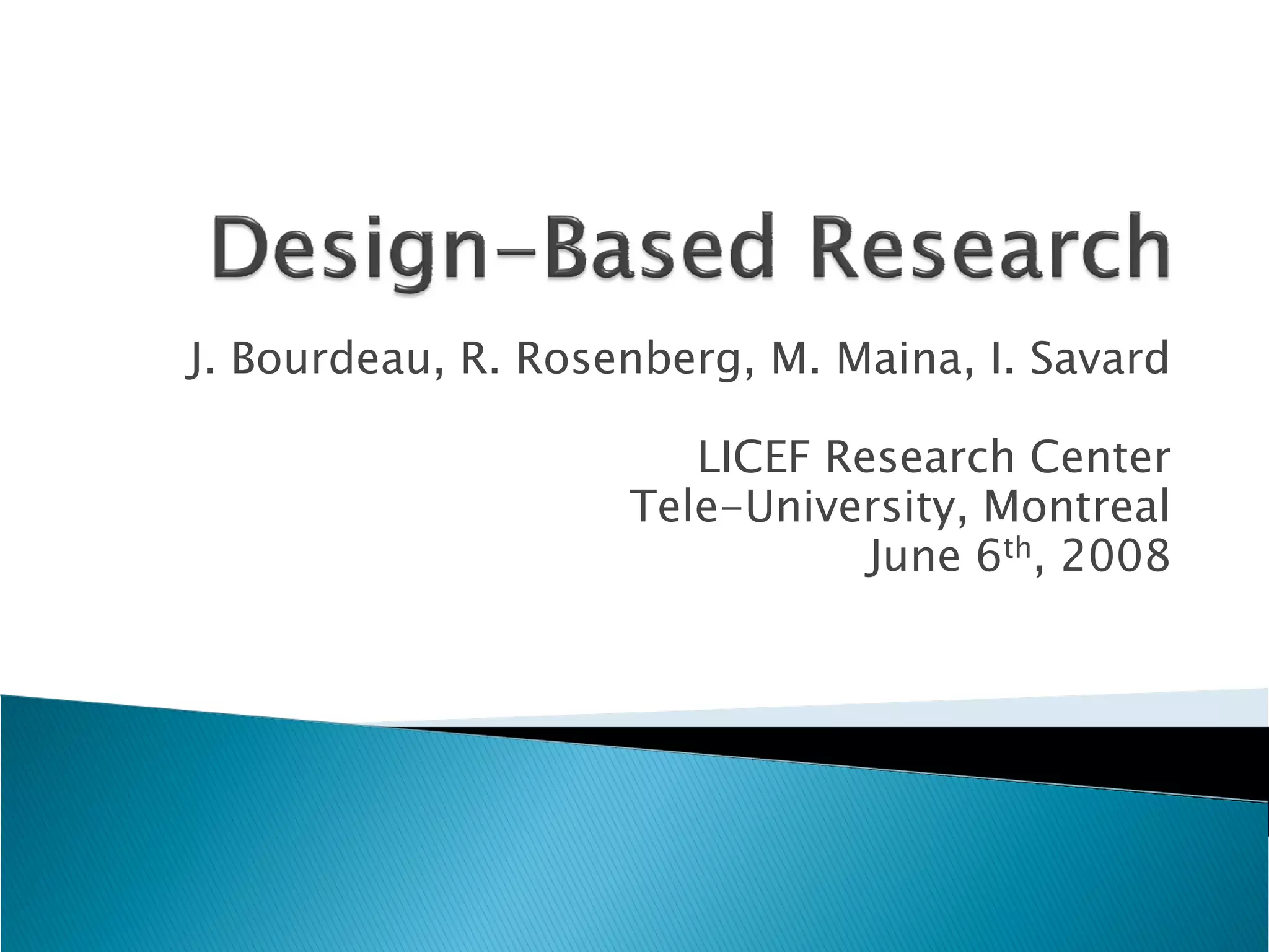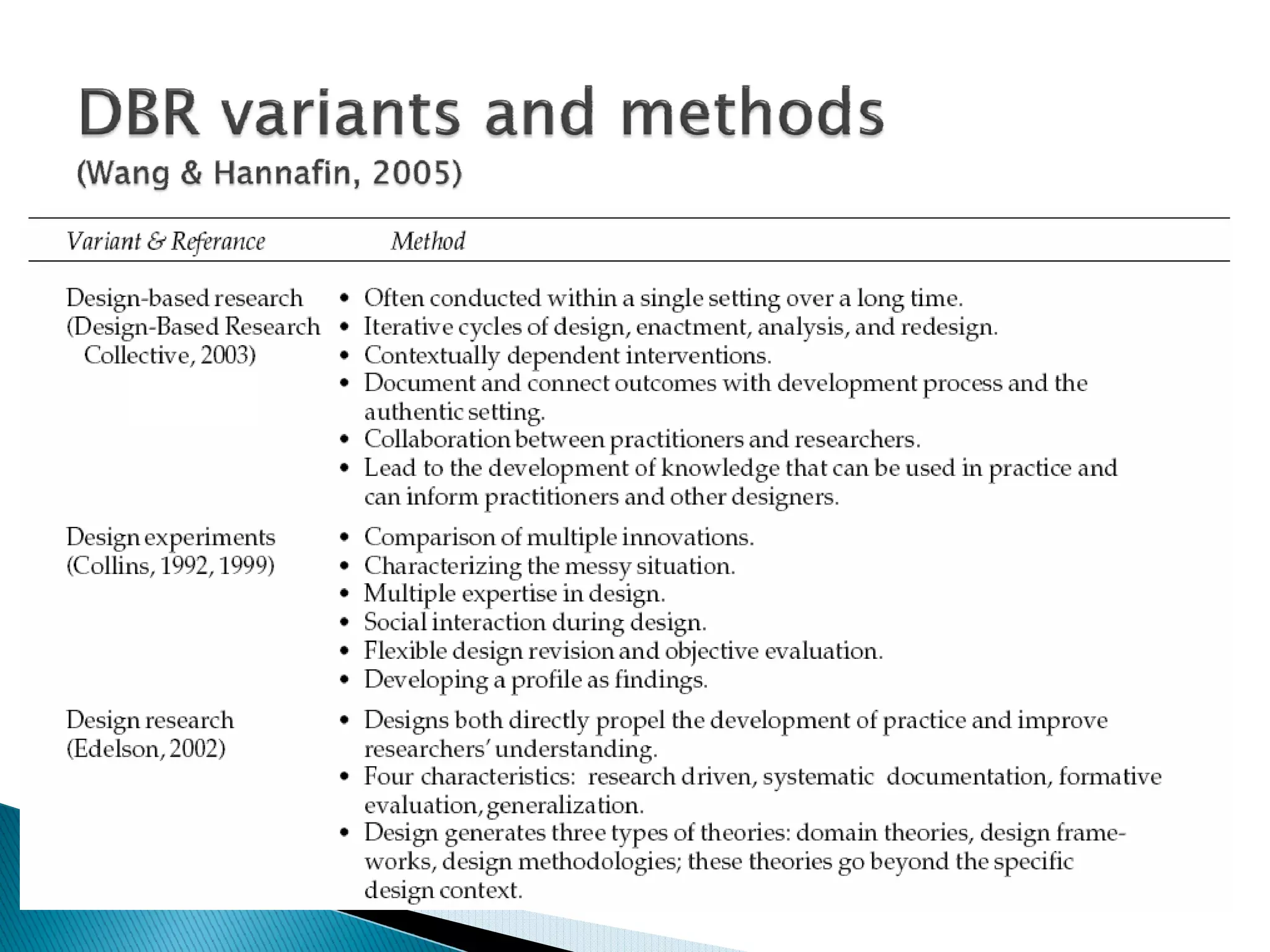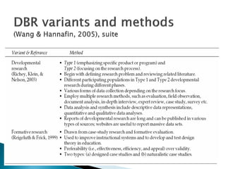 This document provides an overview of design-based research (DBR) as a methodology for educational research. It discusses several key characteristics of DBR, including that it aims to develop theory through iterative design, implementation, and analysis of educational interventions in authentic contexts. The document also outlines typical stages in a DBR process, including developing potential solutions based on existing principles and innovations, implementing those solutions through iterative testing and refinement, and reflecting on how to further develop theories, principles, and solutions.
