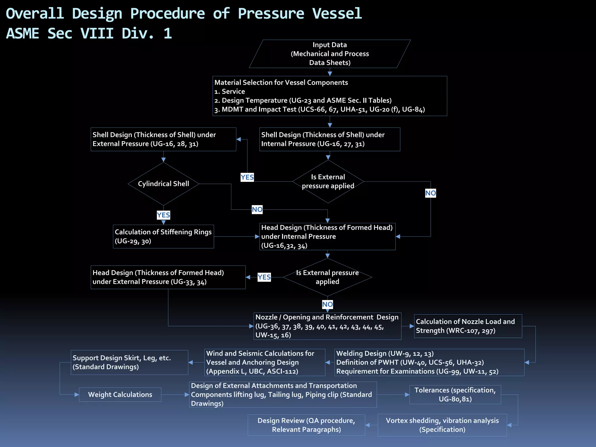 The document outlines the design procedure for pressure vessels according to ASME Section VIII Division 1 and Division 2, detailing the necessary input data, shell and head design under both external and internal pressures, and various calculations for components like nozzles and stiffening rings. It also introduces the concept of 'design by analysis' to prevent different failure modes of pressure vessels through comprehensive stress analysis. Furthermore, the document specifies load conditions, design parameters, and criteria for safety and functionality in pressure vessel construction.
