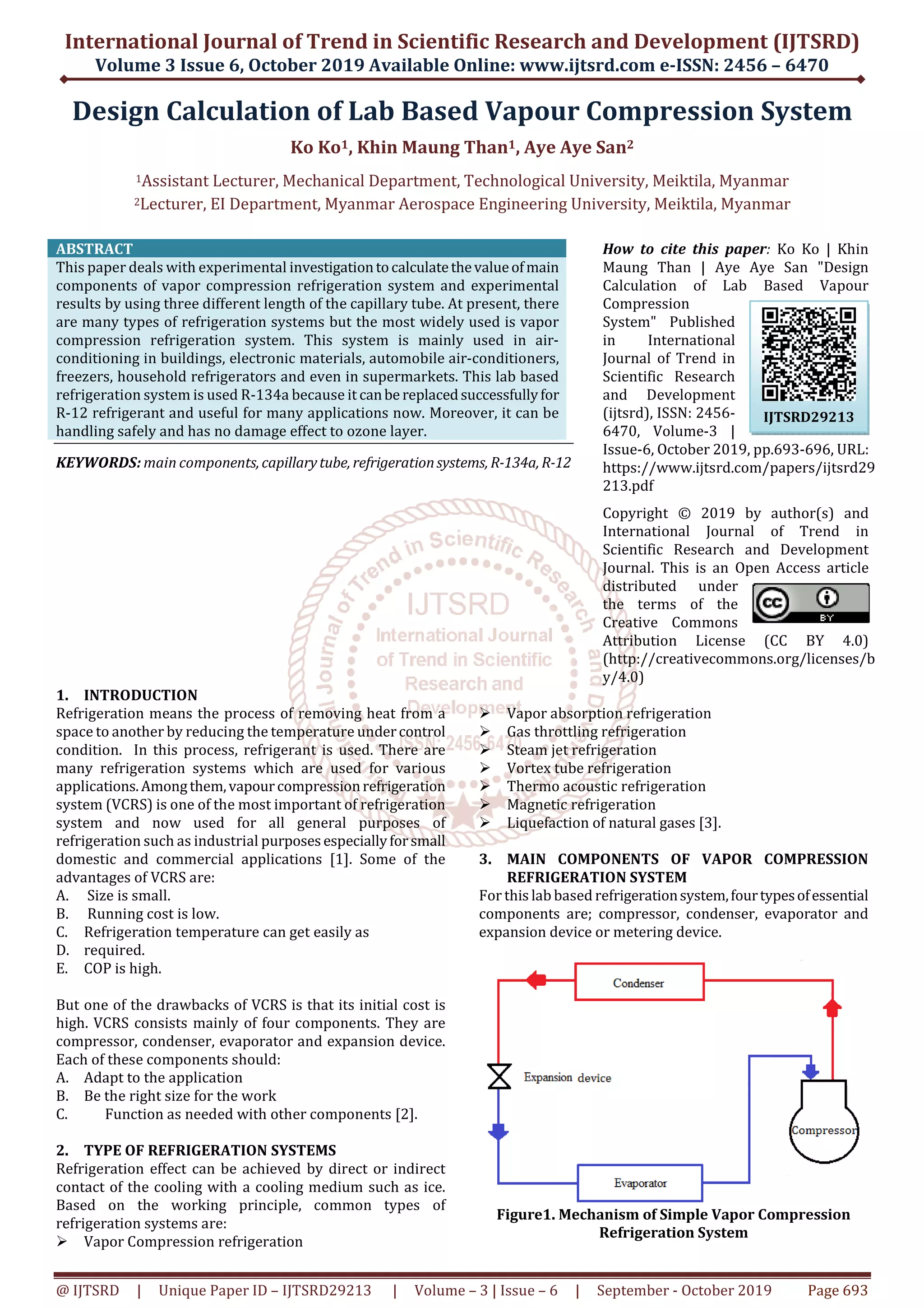 This document presents a study on the design and experimental investigation of a lab-based vapor compression refrigeration system using R-134a as refrigerant. It discusses the system's main components, working principles, and results from calculations involving different lengths of capillary tubes, highlighting the coefficient of performance for each setup. The findings suggest that the system is simple to maintain and suitable for educational purposes in mechanical engineering.