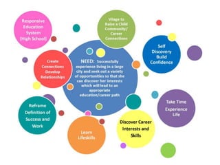 The document provides a summary of ideas generated to help redesign the school-to-work transition for 18-year-old K moving to a larger city. The 67 ideas are grouped under 8 themes: 1) Responsive Education System 2) Village to Raise a Child 3) Reframe Definition of Success and Work 4) Discover Career Interests 5) Self-Discovery 6) Take Time - Experience Life 7) Create Connections 8) Learn Basic Life Skills. The document analyzes the most practical, disruptive, and favorite ideas which include career assessment, reverse job postings, and a guide for life skills questions.
