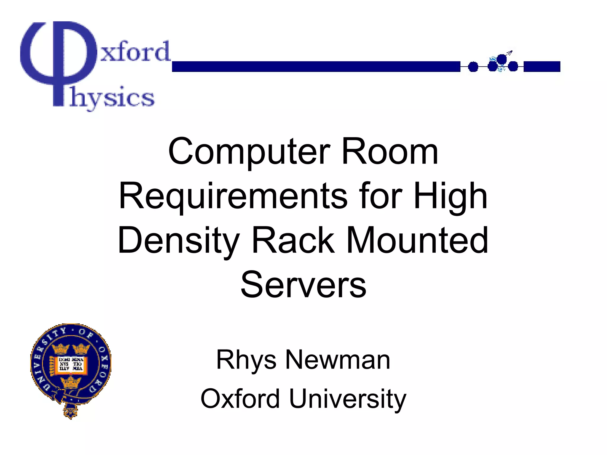 This document summarizes the requirements for a high-density computer room to house rack-mounted servers at Oxford University. It discusses why specialized computer rooms are needed, both historically for security, convenience and size, and currently due to specialized cooling, humidity and power needs of densely packed servers. The document outlines cooling challenges posed by increased server power and proposes solutions like optimized airflow and water cooling. It estimates infrastructure costs, including £400k for a 40-rack room, would represent 25-50% of total project costs, highlighting the importance of efficient computer facilities for high-performance computing.